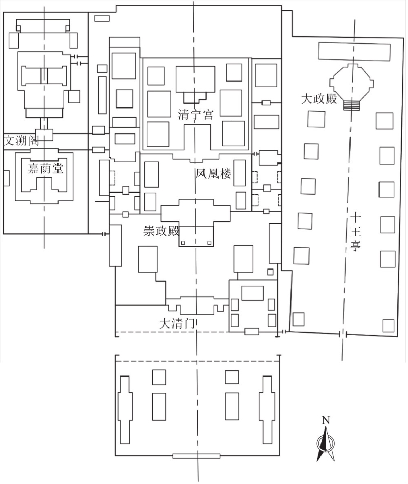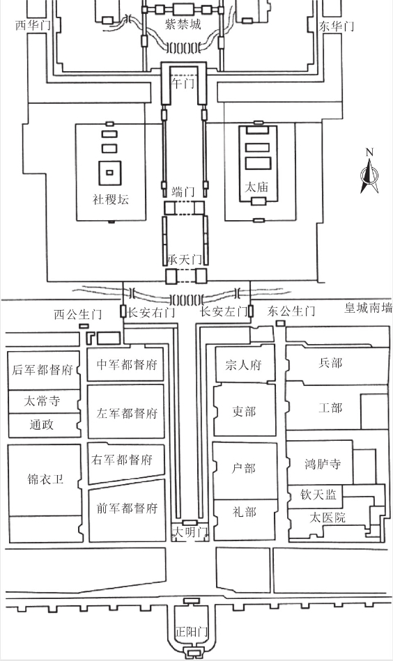 图3.7.8 紫禁城南部轴线两侧坛庙、衙署设置示意图(《中国建筑艺术全集》)