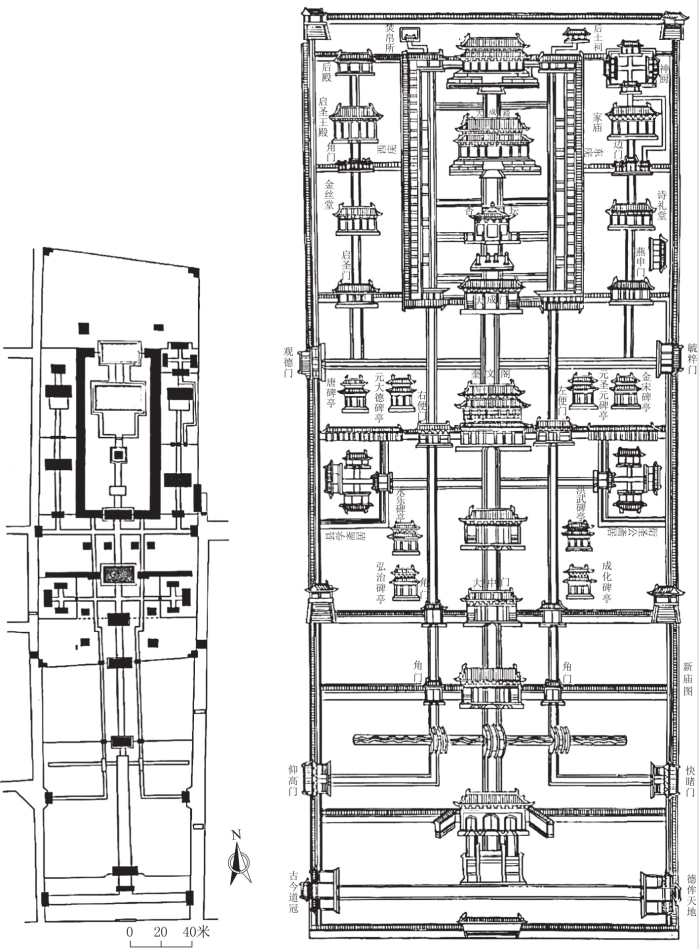 图3.7.13 明代曲阜孔庙平面图(左)与明正德《阙里志》孔庙图(右)(《中国古代建筑史》第四卷)