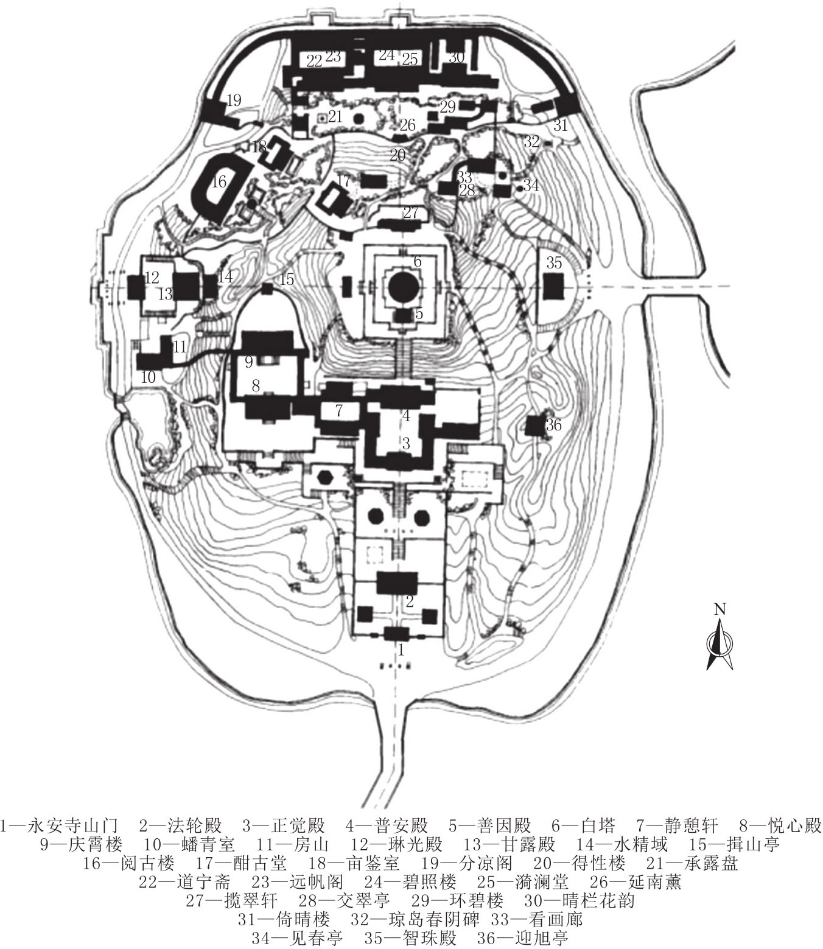 图3.7.15 北海琼华岛平面示意图(《中国古典园林史》)