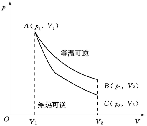 图1.9 绝热可逆过程和等温可逆过程中的